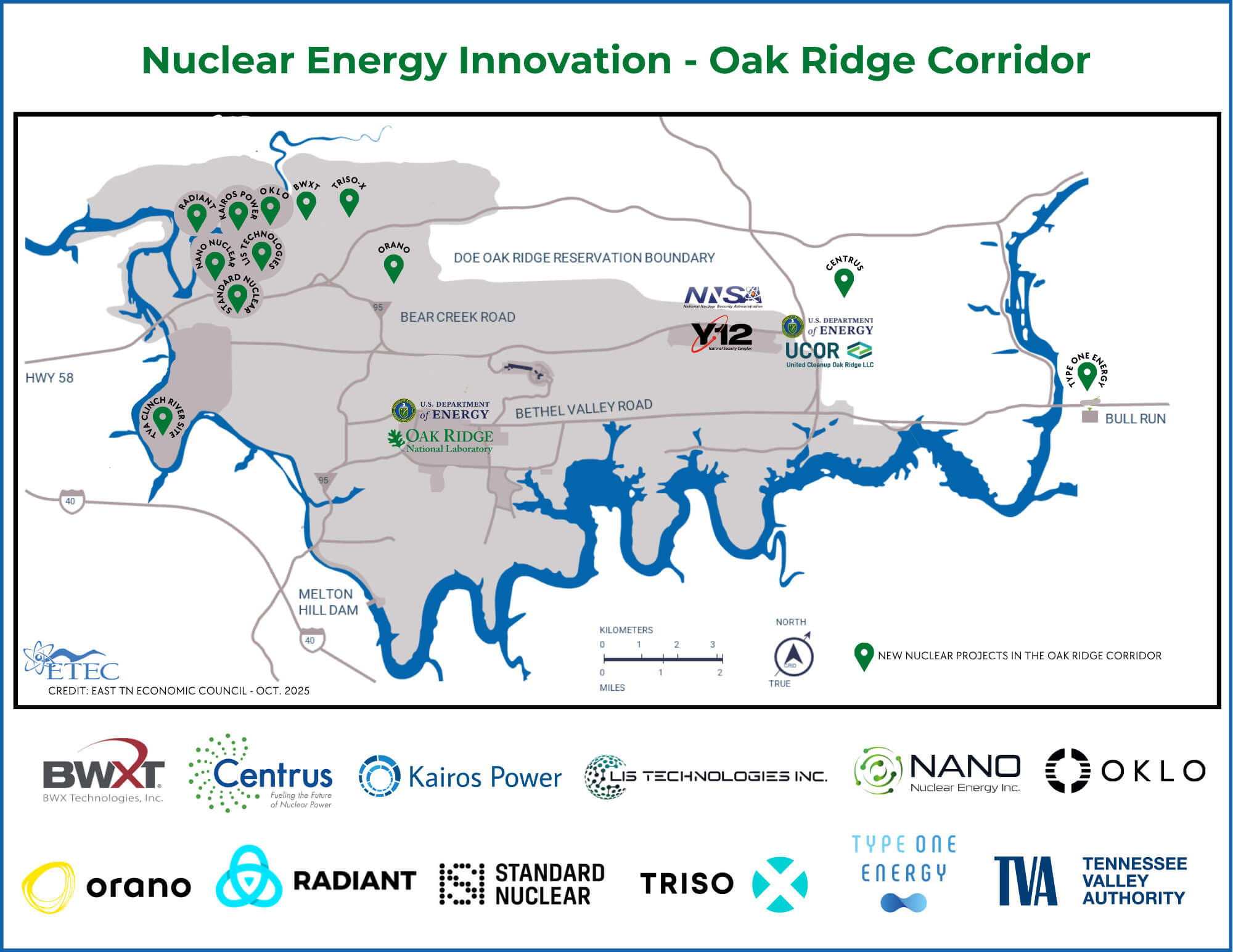 - Home to innovators including Kairos Power, TRISO-X, Standard Nuclear, LIS Technologies, Nano Nuclear, BWXT, Orano, Oklo, Radiant, Type One Energy, and others.